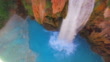 Aerial: Drone moving over beautiful waterfall from rock formation, blue water at Havasu Falls on sunny day - 4K stock video