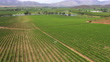 Drone shot of a tractor making its way through the rows of vineyards spraying. Farmers spray the vineyards early summer in the Breede River Valley near Cape Town.