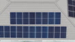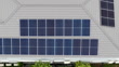 Drone slides above home solar energy system, residential rooftop PV on grey roof, clean energy technology boosts energy independence home, distributed solar generation, electricity bill savings