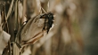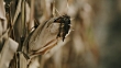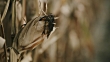 Dolly shot of a drought and diseased corn plant on a field in the late afternoon.