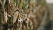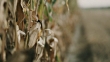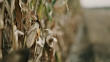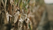 Dolly shot of a drought and diseased corn plants on a field in the late afternoon.