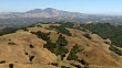 Dry, wooded hills roll toward a mountainous horizon in Ornida, California.