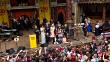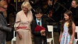 Duchess of Cornwall visits Globe Theatre; BBC POOLENGLAND: London: Globe Theatre: INT*** WARNING SOME FLASH PHOTOGRAPHY ***Camilla, Duchess of Cornwall on stage with Julie Walters (Actress), Chris Evans (Presenter), Tom Hiddleston (Actor), Warwick Davies (Actor), Charlie Higson (author and comedian), Nick Jonas (singer), Andy Serkis (actor) and children / Camilla chatting with Tom Hiddleston and other guests and drinking from cups of tea / Camilla, Hiddleston, Evans, Walters and others posing with children / Camilla arriving on stage with Nick Jonas (singer) and others and presenting children with medals / Camilla, Duchess of Cornwall speech SOT (very faint audio - can't really hear her speech but can hear audience)