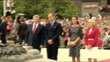 Duke and Duchess of Cambridge Royal Tour of Canada: Official welcome; CANADA: Ontario: Ottawa:EXTVarious Duke and Duchess of Cambridge (Prince William and Catherine (formerly Kate Middleton)) speaking with Stephen Harper (Canadian Prime Minister) and his wife Laureen Harper (not heard) / Close shot Kate smiling / Kate and William along down red carpet with Stephen and Laureen Harper, as waving at cheering onlookers / William and Harper arriving at National War Memorial, followed by Catherine and Laureen Harper / Various of Kate and William standing with Stephen and Laureen Harper at Canadian National War Memorial