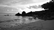 A black and white video of a deserted beach on the Thai island of Koh Lipe at dusk.