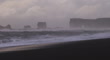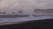 Dramatic landscape of Dyrhólaey and the Black Sand Beach in Iceland. Towering rock formations and the iconic stone arch rise from the misty horizon, their silhouettes softened by the ocean spray and distant clouds. The powerful waves crash against the shore, creating white froth that contrasts sharply with the deep black volcanic sand. The wind sweeps over the surface, sending ripples through the water and carrying mist through the air, creating an ethereal and almost otherworldly atmosphere. The overcast sky casts a moody, diffused light over the entire scene, enhancing the raw, untamed beauty of the Icelandic coastline.VÃk à Mýrdal, Southern Region, Iceland - February 04, 2025