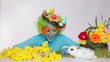 Easter bunny with painted Easter eggs and Blue Girl. Made-up young woman with a nest on his head. In the nest-colored Easter eggs. Rabbit on the table and a basket of flowers.