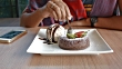 Close-up hand use spoon eating the dessert on the desk. Chocolate lava cake 1920x1080. Shot on BMPCC