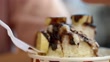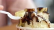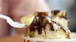 Eating Chocolate banana sliced Bingsu (shaved ice), closed up.