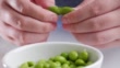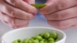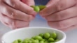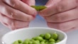 Eating green soy bean, slow motion.