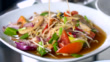 Eating Som tam (Green papaya salad) ,spicy salad made from shredded unripe papaya