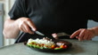 Man eating dish of pressure-cooked and browned rump steak. Sliced cucumber topped with chili sauce. Small and colourful decorative tomatoes. Brownish plate on gray tablecloth.