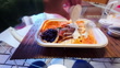 Eating take away chilaquiles, Mexican food at home, pouring the toppings, point of view