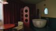 Stylish bathroom scene featuring a white freestanding bathtub, mid-century chair, red circular table, and geometric room divider, all set against deep red curtains and green-tiled walls. A soft glow from the window adds warmth to the retro-modern decor. This space merges vintage charm with contemporary design, perfect for themes of boutique hospitality, interior trends, and lifestyle moments.