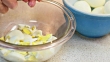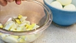 Shown here are different stages of preparing eggs to make salad. The eggs are shown here cut up in a bowl