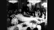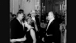 EXT Elysee Palace where French President Charles de Gaulle meets Russian Premier Alexei Kosygin for diplomacy meeting during Kosygin's state visit / de Gaulle and Kosygin seated talking / CU Kosygin / CU de Gaulle / people in evening wear walking through building entrance / de Gaulle and Kosygin stand shaking hands with state dinner guests / INT dining room with multiple chandeliers sparkling / guests begin to sit at tables / guests talk with Kosygin and de Gaulle.