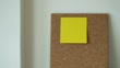 Empty yellow sticky note on a chipboard surface, gently lifted by a breeze, viewed from front. - 4K stock video