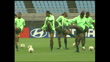 World Cup: England and Nigeria training; JAPAN: Osaka: Osaka Stadium:EXTLS Nigerian Squad kicking legs PAN, LS Nigerian Squad stretching on pitch, LMS Efotobore Sodje (Nigerian Footballer) and Jay-Jay Okocha (Nigeria Captain) stretching on pitch, MS Nwanko Kanu and two other players stretching on pitch, GVs coach and staff sitting on benches watching training session (5 secs), LS coach standing on pitch watching training PULL OUT, GV 'Osaka' sign in stadium PULL OUT to show squad stretching at training session, CS lights in stadium, GVs players stretching PAN, LS Nwanko Kanu jogging along on pitch at training session