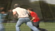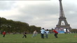 RUGBY UNION WORLD CUP: England/France semi final match: fans watch outside stadium; FRANCE: Paris:EXTBoys having a rugby kick-about on grass in front of the Eiffel TowerInflatable, in shape of rugby ball, advertising Rugby World Cup 2007, suspended on Eiffel TowerFrench fans walking and cheeringNew Zealand fans sporting French coloursHigh angle shot England rugby fans disembarking from train at stationEngland rugby fans along on platformEngland fans leaving station