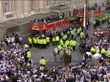 England team stage victory parade following Ashes win; ENGLAND: London:INTKevin Pietersen (England) talking to unidentified woman in hotel lobbySimon Jones (England) and Geraint Jones (England) stand together in hotel lobby surrounded by othersMS Kevin Pietersen (England Cricketer) speaking to press SOT- it's difficult to say how I feel/ this is the first time I've seen the public - it will only start to sink in in a few days' timeEXTLMS Michael Vaughan (England Captain) out of hotel holding baby and accompanied by his wife TRACK BACKTGV crowds surround England team on stationary open-topKevin Pietersen out of hotel holding jug of beer, acknowledges cheers of crowd SOTAndrew Flintoff out of hotel and towards open-top bus (with his wife and child), he gives 'drinking' gesture to unseen person on bus as crowd cheer SOTLA LMS England players on bus top as along, crowd cheerLMS England Women's Cricket Team members on stand on (second) open-top busLS office workers crowd on balcony to cheer passing players on bus PULL OUTMS BV Michael Vaughan waves replica Ashes trophy to cheering crowd from bus (seen from bus)MS Vaughan holding aloft Ashes trophy from busLudgate Hill:LS open-top bus through cheering crowds (St Paul's Cathedral in b/g) ZOOM IN Andrew Flintoff standing at front of bus