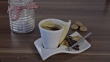 Beautiful espresso cup on wooden table. The coffee sugar splash is in slow motion.