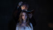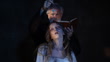 Old monk performing traditional exorcism ritual of possesed girl in dark room. 4k resolution video footage.