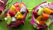 Variety of delicious tropical fruit slices and segments served in hollowed-out pitaya shells. Fruits include papaya, mango, pitaya, pineapple, kiwi fruit and strawberry. Shot from a high angle on a fresh banana leaf background.