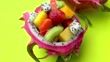 Variety of delicious tropical fruit slices and segments served in hollowed-out pitaya shells. Fruits include papaya, mango, pitaya, pineapple, kiwi fruit and strawberry. Shot from a high angle on a lime green background.