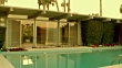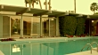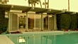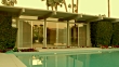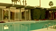 WS TS exterior mid-century modern country club home with floor to ceiling glass windows looking out across swimming pool - HD stock video