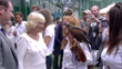 CLEAN: Exterior shots Camilla, Duchess of Cornwall meeting Imogen Davis and hawk Rufus on visit to Wimbledon All England Tennis Club. on July 02, 2015 in Wimbledon, England.