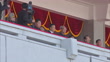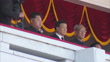 CLEAN: Exterior shots Kim Jong-Un, North Korean Leader sitting next to Chinese Politburo standing committee member Liu Yunshan, watching Workers Party 70th Anniversary Military Parade. on October 11, 2015 in Pyongyang, North Korea.