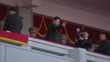 CLEAN: Exterior shots Kim Jong-Un, North Korean Leader waving to crowds and hold up arms with Chinese Politburo standing committee member Liu Yunshan after Workers Party 70th Anniversary Military Parade. on October 11, 2015 in Pyongyang, North Korea.
