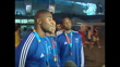 CLEAN: Exterior shots of British Olympians Jason Gardener, Darren Campbell and Mark Lewis-Francis being interviewed outside the Olympic Stadium after their 4x100m relay win on 28 August 2004 in Athens, Greece.
