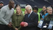 CLEAN: Exterior shots of King Charles posing for a group photo with various people including Tottenham Hotspur FC Women's captain, Bethany England and Men's Captain, Son Heung-min and flag football captain Phoebe Schecter and British NFL player, Efe Obada on the pitch at Tottenham Hotspur Stadium during a visit to celebrate community work on the 12th February 2025 in London, England
