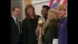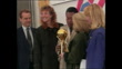 CLEAN: Exterior shots of the US Women's National Soccer team players including Michelle Akers-Stahl and Shannon Higgins holding World Cup trophy with Pelé and Michelle Akers-Stahl interview grab on 8 December 1991 in New York, USA