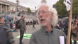 Extinction Rebellion protest in London; ENGLAND: London: Trafalgar Square:EXT GVs Extinction Rebellion protesters in crowdDrummers and chanting 'Act Now'Vox pop (protester) SOT: I think it can be cleaned off...we have to consider things in proportion...Vox pop (protester) SOT: They have done no harm to the painting...soup over glassMid shot protesters with banner 'Feel, Think, Act Together'