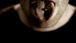 Extreme close up man with shaved head + stubble beard lifting head + sticking out pierced tongue - HD stock video
