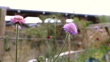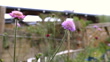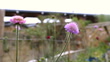 A close-up handheld shot of a purple chive flower. The flower is swaying side to side in the wind. It is growing in a community garden in Newcastle upon Tyne.Stills are available similar to this scenario.