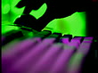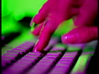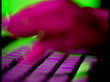 Extreme close up rack focus SIDE VIEW hands working on green computer trackball + pink keyboard - stock video