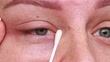 Close-up of an eye being carefully cleaned with a cotton swab. The eye appears slightly irritated, with dried pus around the lashes and redness, infection or inflammation. The person is gently removing debris to keep the eye clean.