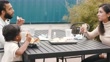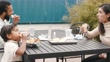 Family eat lunch together at casual outdoor restaurant - 4K stock video