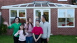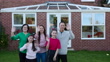 A handheld front-view portrait shot of a family standing together smiling and waving while looking at the camera in a garden at a home in Newcastle, England.