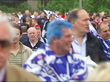 Football fans along, some wearing Chelsea FC and Manchester United FC football colours, including one man with hair sprayed blue, one man waving Chelsea Football Club flag and some carrying cans of beer as klaxons heard occasionally (one man flinching at klaxon noise) SOT
