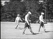 Fans move to 17th tee / Ralph Guldahl swings / Bobby Jones takes a photograph sitting on ground / Bobby Cruikshank hits golf ball / Gallery moves to 18th green, Vic Ghezzi misses put but wins tournament / men shake hands / crowd walks away. Pinehurst golf course on January 01, 1938 in Pinehurst, North Carolina (Footage by Getty Images)