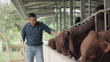 Farmer working at cattle farm, caring for cows in livestock barn. Concept of agriculture, animal husbandry, rural lifestyle, and sustainable farming with focus on livestock care and management. - 4K stock video