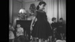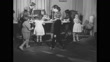 Title: "Fashions Strictly for the Younger Set" superimposed over four boys wearing Tom Sawyer, Penrod, Little Lord Fauntleroy, and Huckleberry Finn outfits / CU boy in Fauntleroy outfit / VS boy in suit sitting at piano, stands and adjusts metronome, turns toward camera to show off suit and checked vest / CU VS boy wearing ski outfit with gloves / MS two boys one wearing jeans the other in grey flannel slacks, boy in jeans puts on coonskin hat and plaid jacket, boy in slacks puts on sports coat // Intertitle: "Paris" superimposed over toddler girl and boy about age five walk over to table where children are sitting / MCU toddler eating cookies / boy and girl at table, girl drinking out of teacup / children get up and run from table / children sit in circle in parlor-type setting / MS boy and girl walk in circle showing off clothes / VS little girls in underwear looking through rack of clothes, one trying some clothing on / little boy walks into dressing room and little girl pushes him out / girl walks in circle showing off dress / children applaud / CU toddlers applauding / little girl with raised pinky drinks tea, other girls applauds / little girl twirls around in her dress / Note: exact day not known