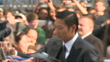 'Fast and Furious' film premiere: Arrivals; Fans behing barriers / Back view Actress Jordana Brewster (wearing white strapless dress) posing for press then along to sign autographs for fans / Sung Kang (actor) signing autographs and posing for pictures with fans / Brewster as interviewed by television crew on stage (not heard)