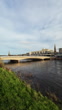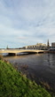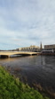 Inverness, Scotland - December 20 2025: Vertical wide-angle morning view of Ness Bridge spanning the fast-flowing River Ness in Inverness, Scottish Highlands. Filmed from the west riverbank with winter grass in the foreground, the shot looks toward the bridge and city centre buildings on the east side of the river. The current bridge is a prestressed concrete structure built in the 1960s to replace an earlier 1855 suspension bridge that once crossed this section of the river.