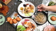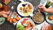 Father and daughter eating together happy family at home. On the table are Mixed Fried Rice with Shrimp , French Bread with Shrimp , American Fried Rice with Fried Egg and Ham and Spaghetti - 4K stock video