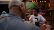 Father and son talking and eating at restaurant - 4K stock video